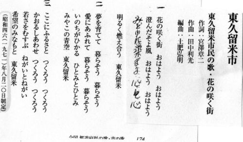 図書館で面白い本を見つけた。全国都道府県市町村の歌の歌詞とその成立経過を記したもので、それによるとなんとわが町東久留米市にも市歌の存在することが分かった。どこで歌われているのか歌われていないのかとんと聞いたことがないので、メロディは分から…