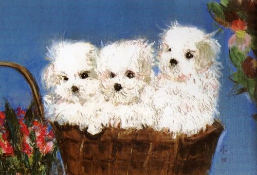 ●下記2枚の絵は事故や障害で手の不自由な方が口と足で書いた絵の力作です。年に2回、絵葉書にまとめられた画集が我が家に送られてきます。その中から、私の好きなのを2点紹介します。 最初のはかわいいワンちゃん。毛のリアリティが素晴らしい。 バイオリン…